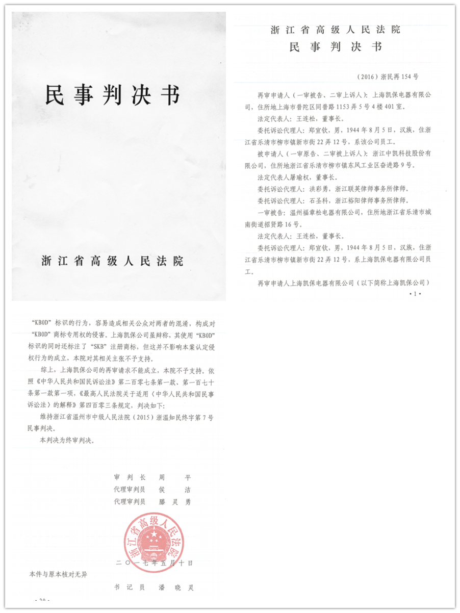 2017年5月10日,浙江省高級人民法院作出終審判決,中凱一場歷時三年的商標維權案終于塵埃落定。本案得從2014年3月說起,因上海凱保長期蓄意侵害中凱商標權,在產品包裝盒、產品標牌、企業官網、產品樣本、廣告等媒介平臺上大量使用與中凱KB0、KB0J、KB0D等商標相似或近似字樣,并有意作一些誤導消費者的宣傳,被中凱訴至法院。樂清市法院受理此案后,通過大量的調查了解,以大量的事實證據為依據,認定上海凱保侵權事實成立,判令上海凱保停止侵權,賠償損失。上海凱保不服,上訴到溫州市中院,溫州市中院通過對案件的審查,最終在充分的事實和證據基礎上作出了維持一審判決的二審判決。上海凱保為達到其不可告人的目的,使出一套“纏”和“拖”的絕技,對二審法院的判決仍然表示不服,向浙江省高院提出再審申請。省高院受理案件后,開庭再審該案,在大量的事實和證據面前,最終作出了維持溫州市中院二審判決的終審判決。這一判決,標志著一些別有用心,惡意侵害或蓄意侵占中凱商標權的不法行為的破滅。