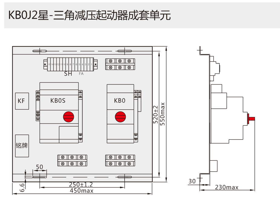 以KB0作為主開關,與適當的時間繼電器、電氣聯鎖、機械聯鎖等附件組合,構成Y-△減壓起動器成套單元KB0J2(以KB0-F消防型產品作為主開關,可構成消防型Y-△減壓起動器成套單元KB0J2-F, 具有過負荷僅報警不跳閘,短路時報警+跳閘的功能。)可實現110kW及以下的電動機的Y-△減壓起動控制與保護。