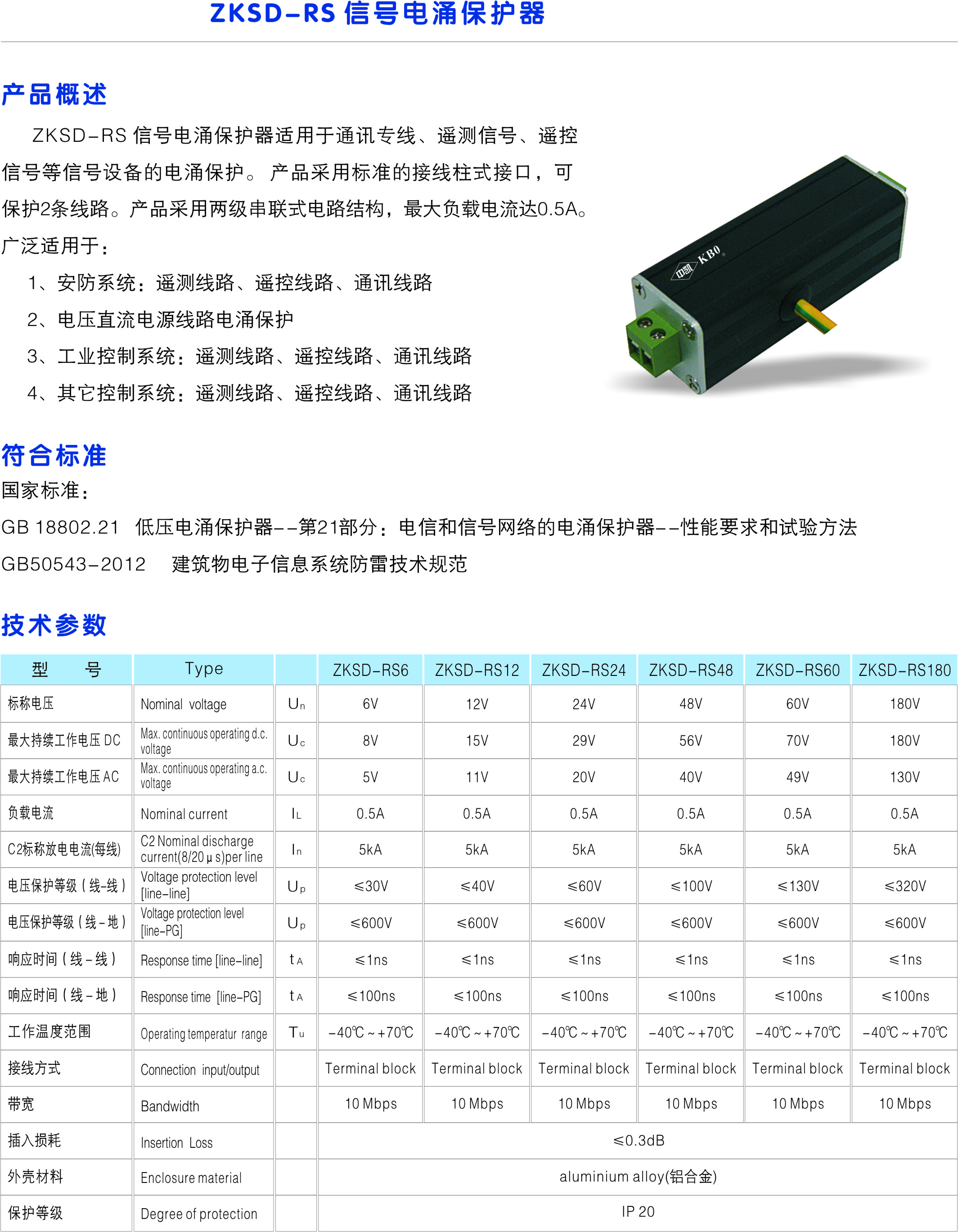 ZKSD-RS信號電涌保護器適用于通訊專線、遙測信號、遙控信號等信號設備的電涌保護。保護類型:標準接線柱式接口(ZKSD-RS)、RJ45接口(ZKSD-RJ45)、BNC 頭同軸接口(ZKSD-BNC)、監控+電源二合一(ZKSD-CCTV)。